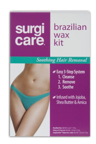 Go fashionably bare with this dermatologist-approved wax formula. NO STRIPS NEEDED - MICROWAVEABLE WAX. Now you can wear your most revealing lingeris or swimsuit with confidence. For that sexy, bare look, rely on our SurgiCare Brazilian & Body Wax Kit for removing unwanted hair safely and completely. Our exclusive Cleanse & Prep Gel is infused with eucalyptus, camphor and arnica to gently cleanse and cool your skin before removing hair. Enriched with protective and soothing botanicals, SurgiCare Brazilian & Body Wax is easy to use. No muslin strips are needed. Simply warm the professional grade wax in a microwave and apply. In seconds, the dermatologist-approved formula works gently to remove hair. After lifting off the wax, your skin is smooth and hair-free - ready for your sexiest outfit. SurgiSoothe Replenish Lotion contains extracts of papaya, citrus, olive and arnica, known to reduce inflammation. Apply moisturizing SurgiSoothe Replenish Lotion after hair removal and your skin will love its calming effect as it reduces irritation and redness. SurgiCare products and Easy 3-Step System are dermatologist-approved. In this package: Brazilian & Body Wax 6 oz, Cleanse & Prep Gel 1.25 oz, SurgiSoothe Replenish Lotion 1.25 oz.